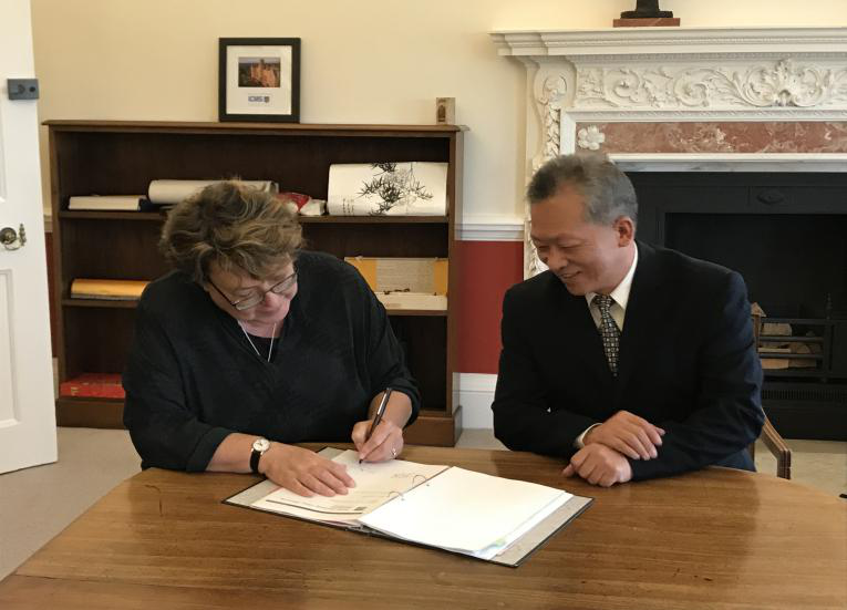 | 图为罗金铭副校长与伯恩茅斯艺术大学校长签署合作备忘录 |