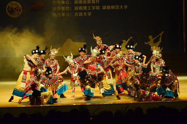 图为我校学子表演的湘西苗族风格男女群舞《玛缒俎》 侯超摄
