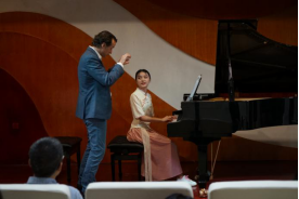 上午10点10分,大师课在学院钢琴演奏厅拉开帷幕。王歆然、谭悦等7名钢琴专业的研究生和本科生逐一登台示范表演,分别演奏了贝多芬、舒伯特、肖邦等名家的乐曲。学生示范时,Tom老师都会全神贯注地站在其身后,一边侧耳倾听演奏的音准、节奏、乐句划分及情绪表达等演奏效果,一边仔细观察学生指法、断奏方法、装饰音奏法、踏板运用等演奏技法。每个学生演奏完毕,Tom老师在肯定同学们的基本功之后,细致点评演奏中有待改进的地方,特别强调对作品的理解和作品特点与技法结合的重要性。每到关键处,他都会亲手示范,甚至手把手指导,让学生感受到不同节奏、手指力度和手键间距、手脚配合等技法运用所带来的不同效果。两个小时的大师课一晃而过,每位表演者表示受益匪浅,全场师生对大师班的授课也是赞赏有加,他们希望学校多邀请这样的艺术家来现场教学,进行实践交流。
