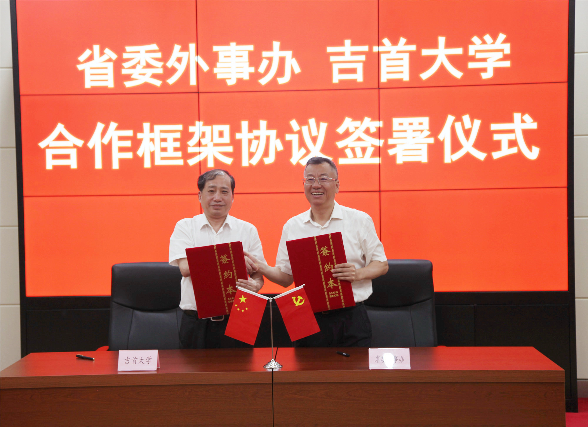 本网讯(唐小田)6月4日,中共湖南省委外事工作委员会办公室与吉首大学签订战略合作协议。省委外事办主任徐正宪与我校党委副书记、校长廖志坤代表各自单位签约。省委外事办副主任刘启峰主持仪式,省委外事办相关处室负责人和我校相关人员出席签约仪式。