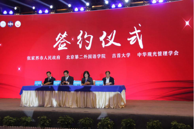 开幕式前,廖志坤校长接见了高雄餐旅大学林玥秀校长率领的台湾专家、学者团队,双方进行了友好交流,表达了在旅游研究与旅游人才培养等方面展开合作的强烈愿望和现实需求。开幕式中,廖校长代表学校与张家界市人民政府、北京第二外国语学院和中华观光管理学会共同签署了校地、校校及校企合作的框架协议。