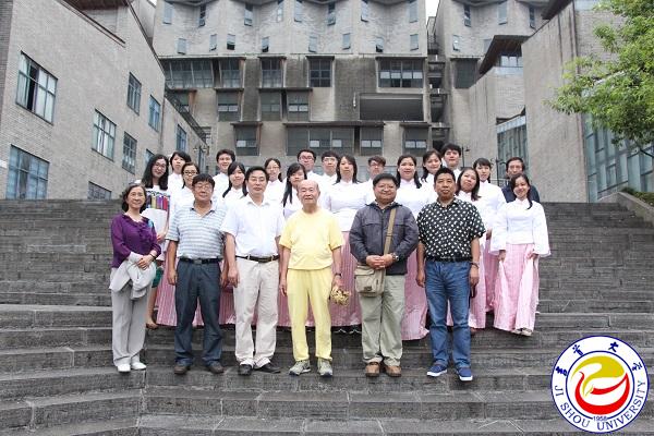 本网讯(学生记者刘雷洪 张欣)2015年7月10日下午,台湾华梵大学中文系师生一行22人在其荣誉团长王柏铛以及该校文学院院长王隆升率领下,来到我校访问交流。我校校办、外事办、文学与新闻传播学院、国际交流与公共外语教育学院等相关单位负责人热情接待了来宾,并陪同来访客人参观了我校校园环境。王柏铛下车后由衷的赞叹到:“吉首大学的环境很优美。”
